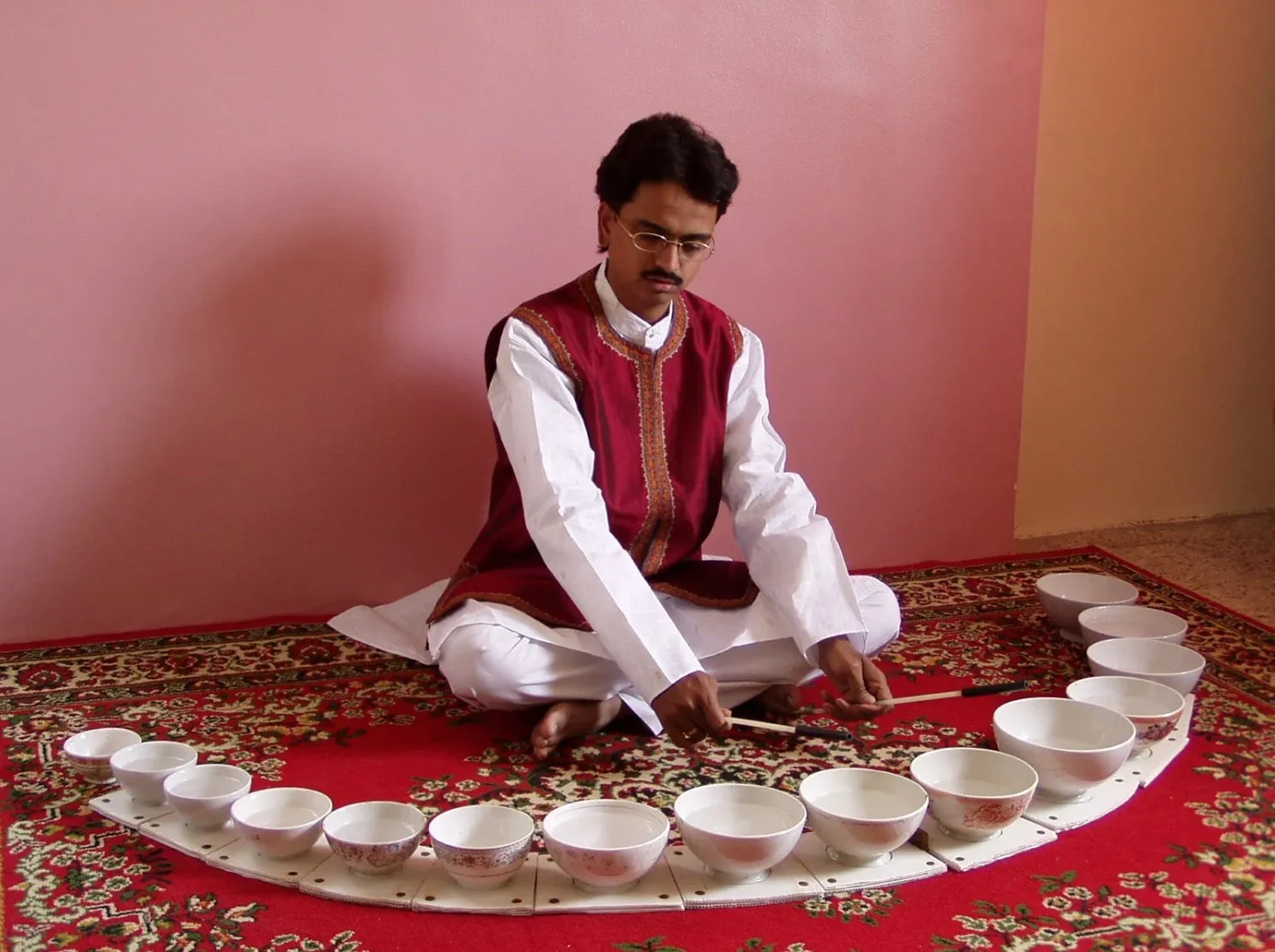 Also known as jal tarang (Hindi: जलतरंग) meaning waves of water this is a traditional, Indian subcontinent percussion instrument dating back to the 4th–6th centuries CE, comprising up to 22 porcelain or glass bowls filled with water and struck with sticks. The cups and bowls vary in size and volume of water for different, fine adjustment of pitch, and the ensuing sound is xylophone-like, gentle and pleasant to the ear.