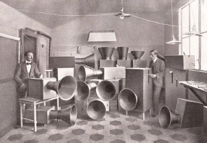 Russolo didn't make electronic sounds, but he did build basic noise-generating instruments called Intonarumori, crazy-looking acoustic contraptions that variously comprised drums, wheels, string, horns, funnels, handles and more, but his aim was to get away from conventional classical sounds.