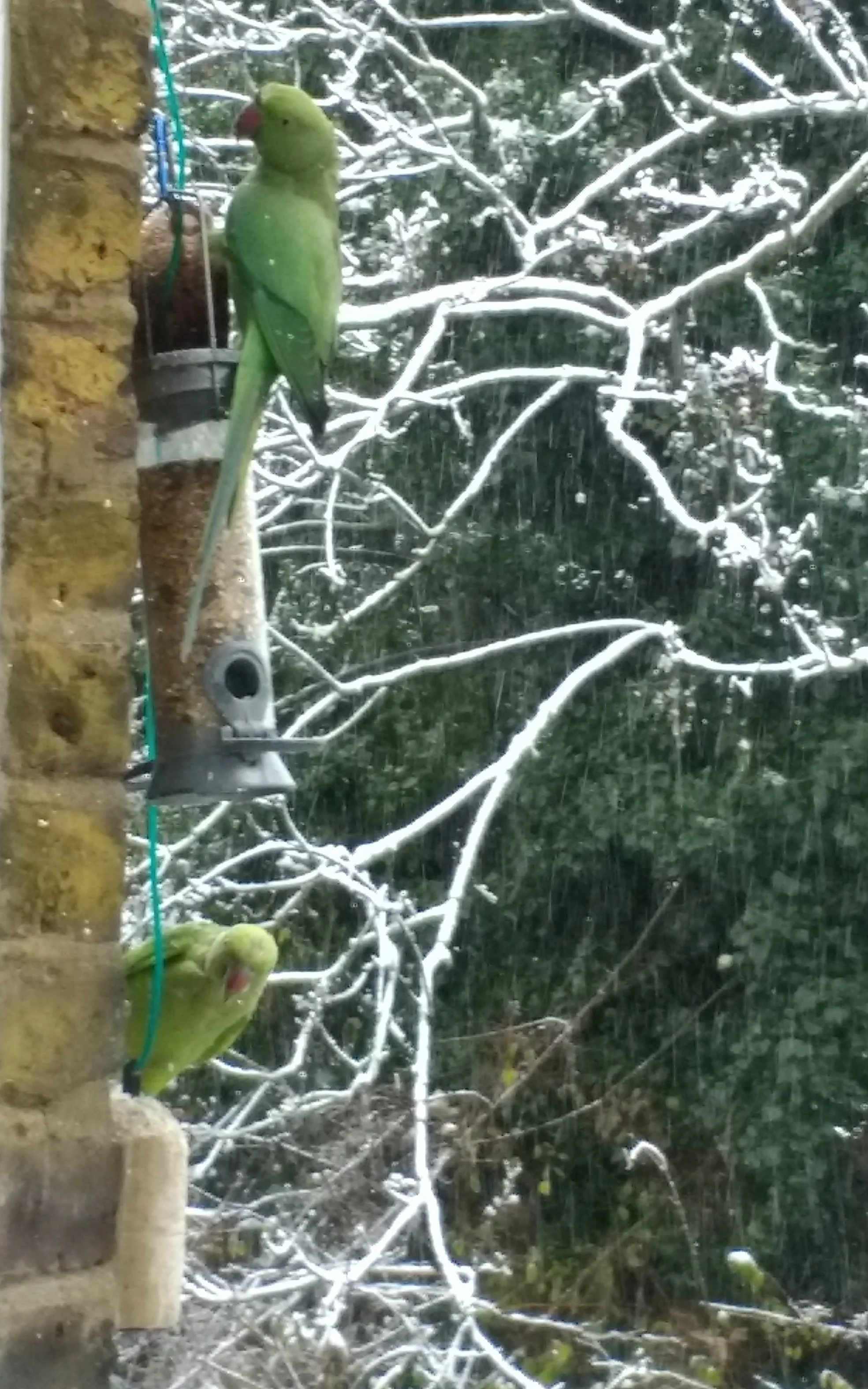 Wild parakeets at my window in London in wintertime