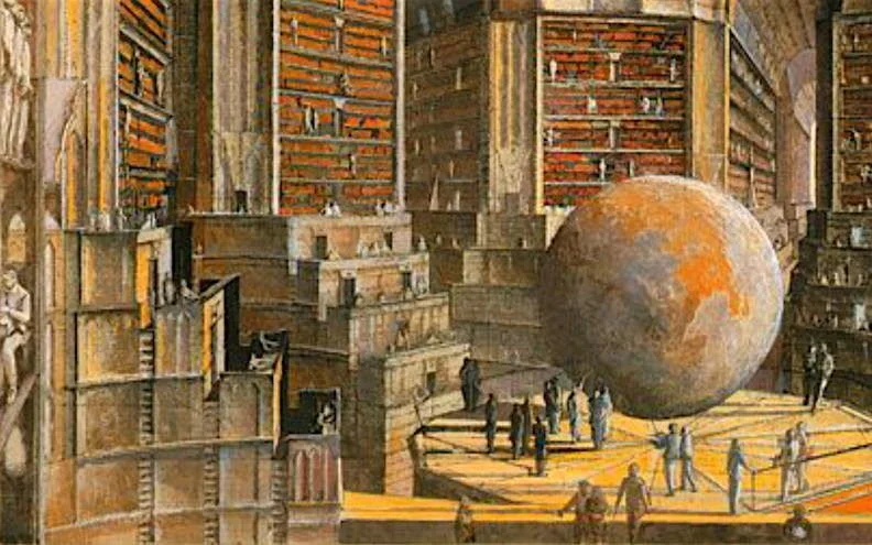 Libraries have also been the inspiration for many books themselves, such as Jorge Luis Borges’s The Library of Babel, imagining an infinite library containing every book ever written and every book that might be. It’s made up of interconnected hexagonal rooms, all identical and containing standardised bookshelves and randomised books in which some are gibberish, others not. Titles include: “Everything: the minutely detailed history of the future, the archangels’ autobiographies, the faithful catalogues of the Library, thousands and thousands of false catalogues, the demonstration of the fallacy of those catalogues, the demonstration of the fallacy of the true catalogue, the Gnostic gospel of Basilides, the commentary on that gospel, the commentary on the commentary on that gospel, the true story of your death, the translation of every book in all languages ….”