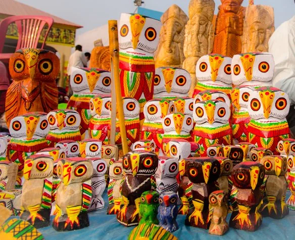 Wooden owls in West Bengal, India