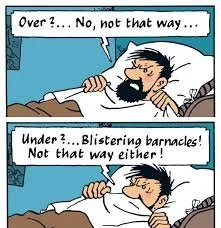 So finally, it’s time to plump for indecision, a topic that could be inspired by anything from picking people for jobs, voting in elections to value-for-money shopping, but mostly where feelings ebb and flow, whether stop or go, to say or be silent, and all the uncertainties and oscillations of love, but also whether throw down the challenge of a dueller’s glove, or like Captain Haddock in Hergé’s Tintin and the Red Sea Sharks, to sleep with your beard under the blanket, or above.