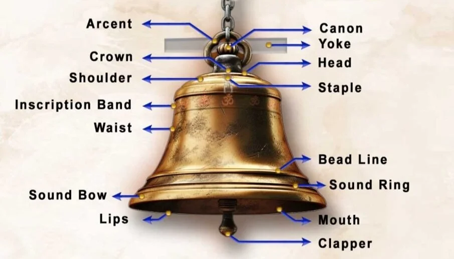 A conventional bell is a beautiful thing, a resonant body, with parts that chime with our own, timelessly forged, and made up of various parts from yoke or headstock, canons, crown, shoulder, waist, sound bow, lip, mouth, bead line and of course the clapper, also known as uvula, that swings and strikes the bell’s inside. Bells are usually made from pressed metal, sometimes glass or ceramic, but large bells such as a church, clock and tower bells are normally cast from a bell metal, originally a combination of brass and tin, but the largest, found in churches, enjoy a mix of 80% copper and 20% tin to bring the cleanest, warmest sound.